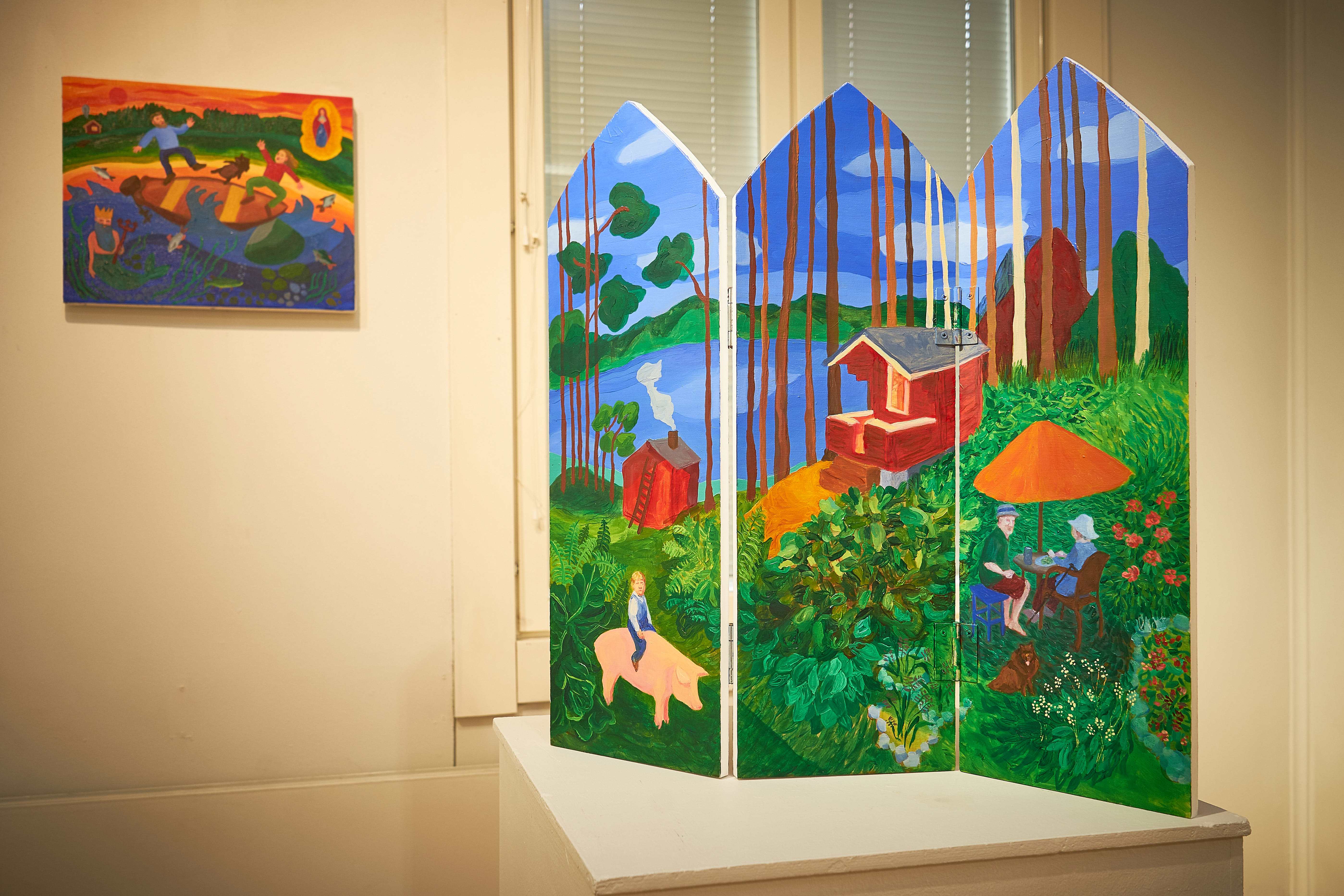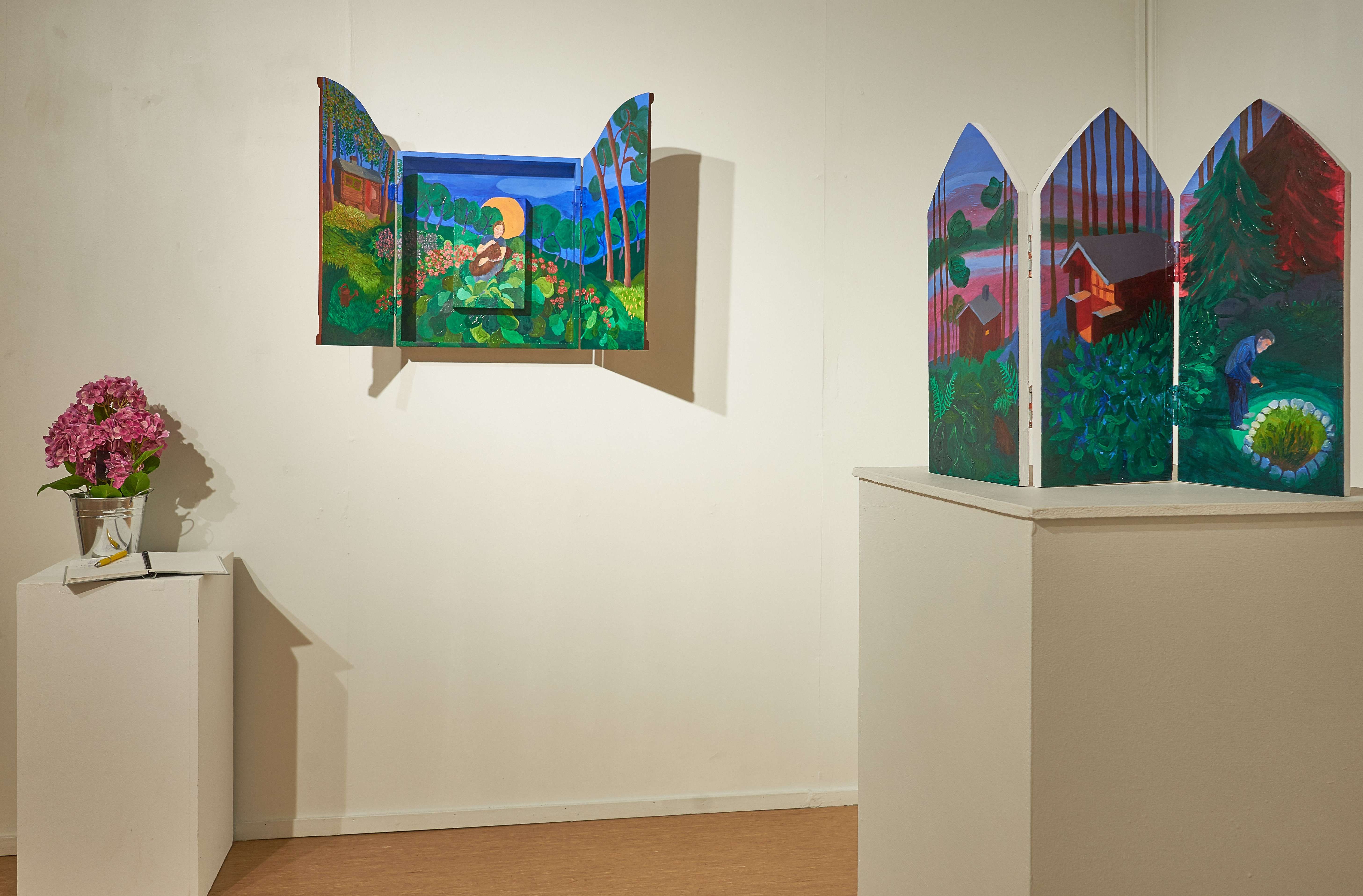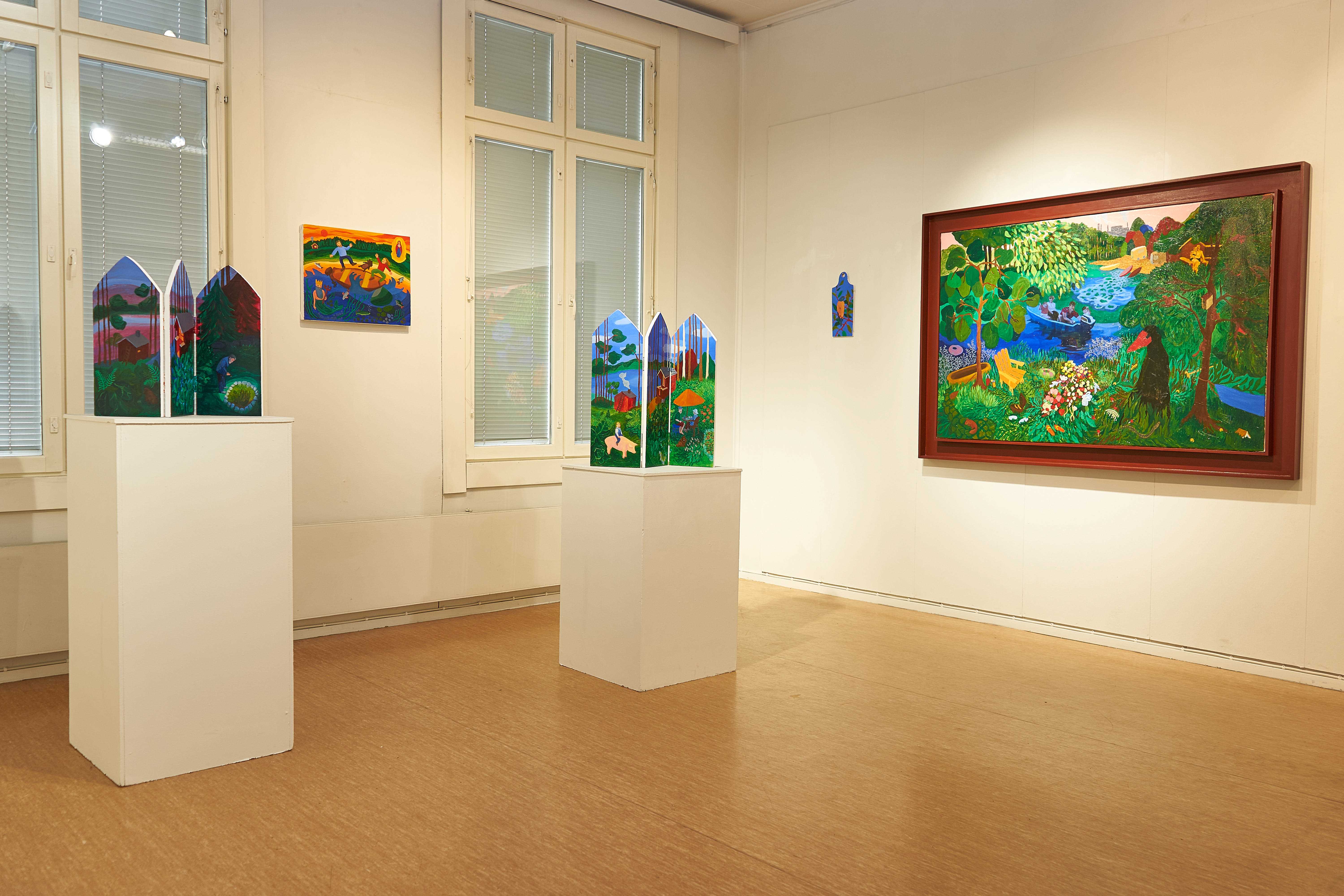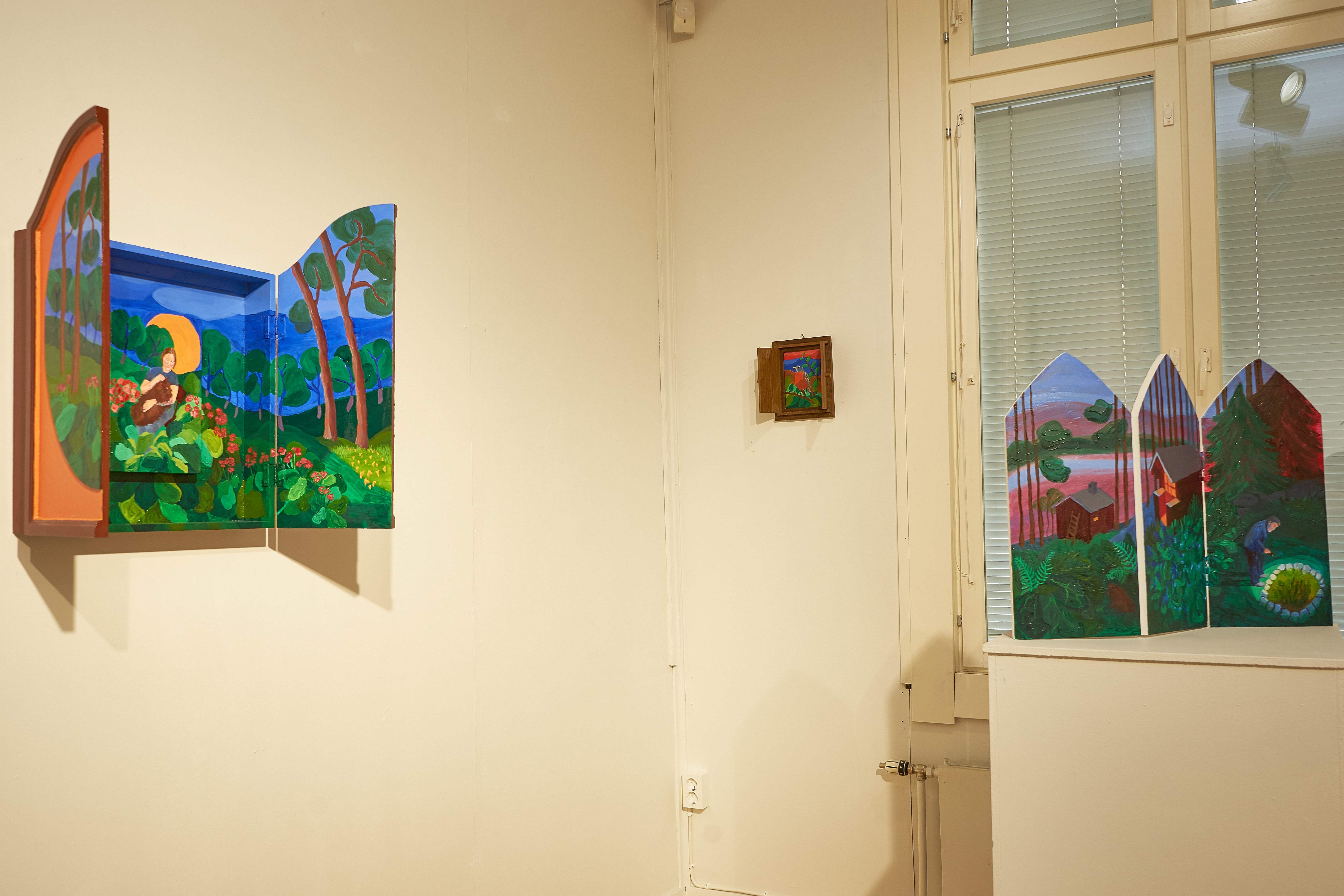Hoivavietti, 2025, öljy puulle ja kankaalle, 60 x 44 x 9 cm Siunaus, 2025, öljy kankaalle, 170 x 240 cmLintukoto I & II, 2025, öljy puulle, 30 x 20 x 25 cm & 29 x 15 x 20 cmThank You for The Food Jesús & María, 2025, öljy levylle, 66 x 36 cmJää hyvästi Jämsänkoski, 2024, öljy kankaalle, 100 x 150 cm Escape on A Horse, 2024, öljy kankaalle, 150 x 160 cm Kappeli, 2023, öljy vanerille, 180 x 240 cmLepopaikka, 2023, öljy vanerille, 180 x 240 cm